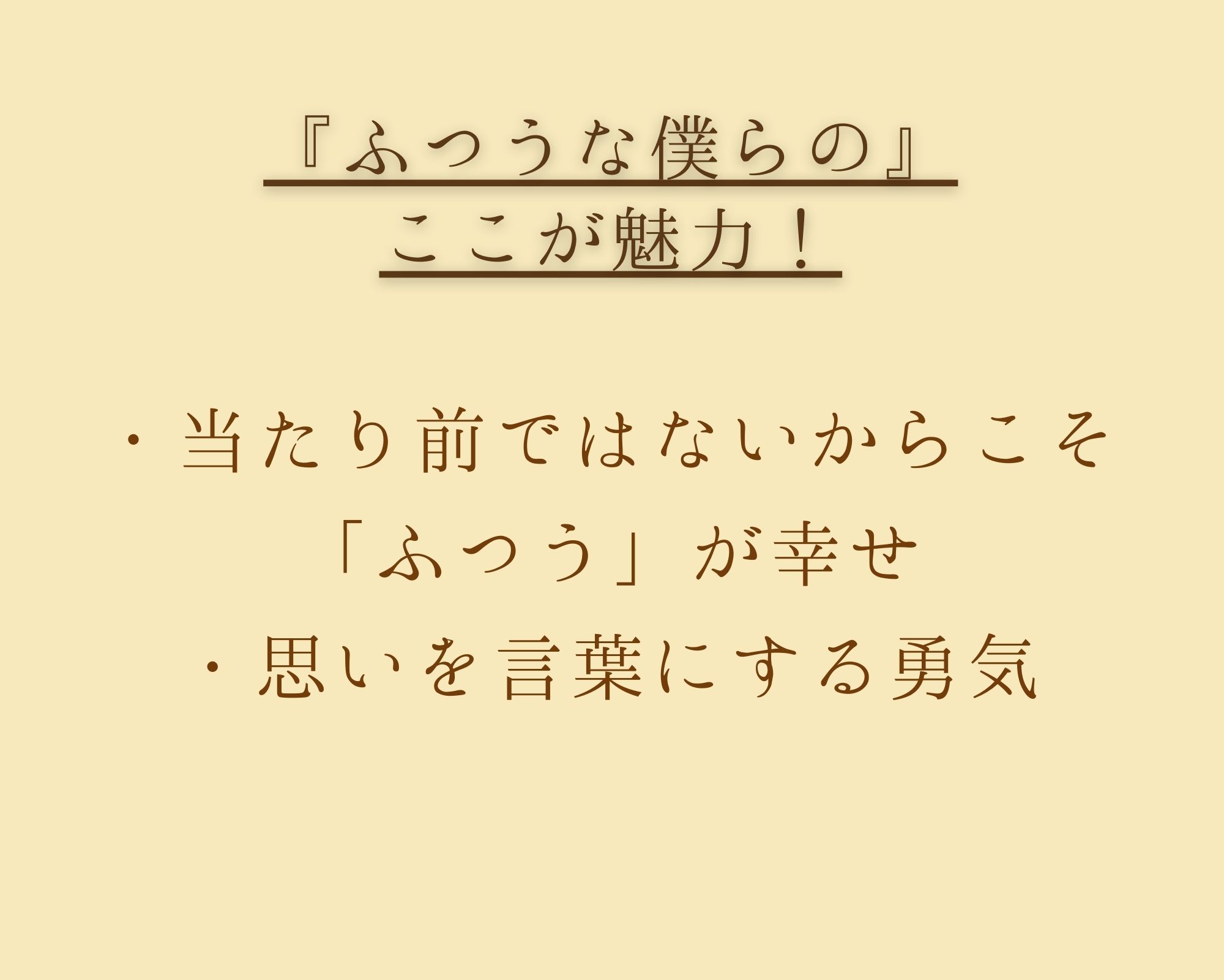 口で伝えたくても、つい面倒くさくてチャットで終わらせてしまいませんか?相手を見て丁寧に言葉にすることで初めて本当の気持ちがわかることもたくさんあります。思いを言葉にすることで関係を築いていく展開が『ふつうな僕らの』の持ち味です。