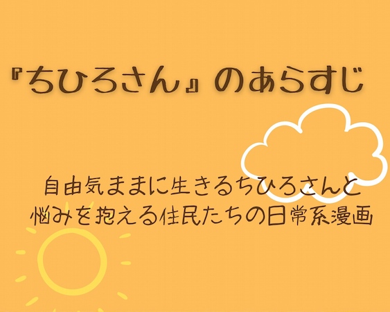 常識に囚われずに生きるちひろさんの日常生活と、この町に住む人々たちとの少し懐かしさを感じる人間関係を描いた漫画です。