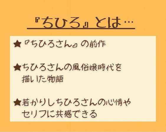 2013年から連載が始まったこの漫画は、実は前作『ちひろ』をもとに描かれていました。『ちひろ』では、風俗嬢だった頃のちひろさんが主人公。夜の街でも断トツ人気を誇るちひろさんですが、感情の起伏が激しく悩む姿をよく見せます。たくさんの人の悩みを解決する『ちひろさん』での姉貴的存在とはまったく違った印象です。ところが共通する部分もあるのです。