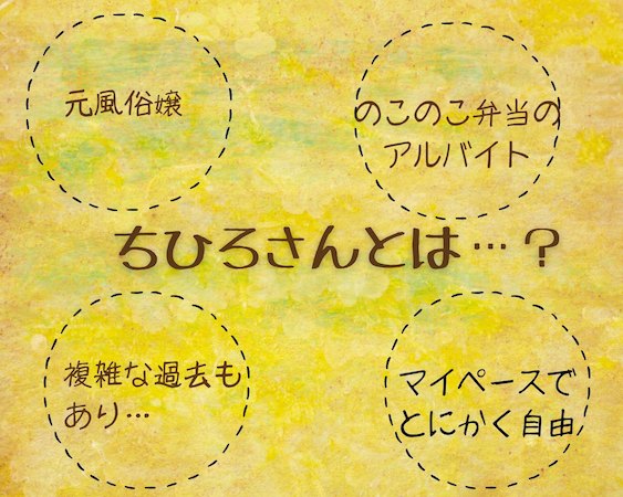 弁当屋「のこのこ弁当」で働いているちひろさん。彼女が店番をするときには、いつもたくさんのお客さんがやって来ます。元人気ナンバーワンの風俗嬢だったこともあり、会話上手。お客さんのなかには悩みを聞いてもらうために店に出向く人も。自由気ままで幸せそうなちひろさんに憧れている人も大勢います。