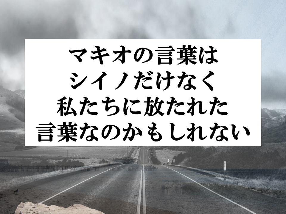 岬に到着した直後、ひったくりに遭ってしまうシイノを助けたのは、マキオというひとりの男。彼もまた訳ありのようでした。マリコへの気持ちをぶちまけ思わず岬から飛び降りようとしたシイノをマキオが止めます。