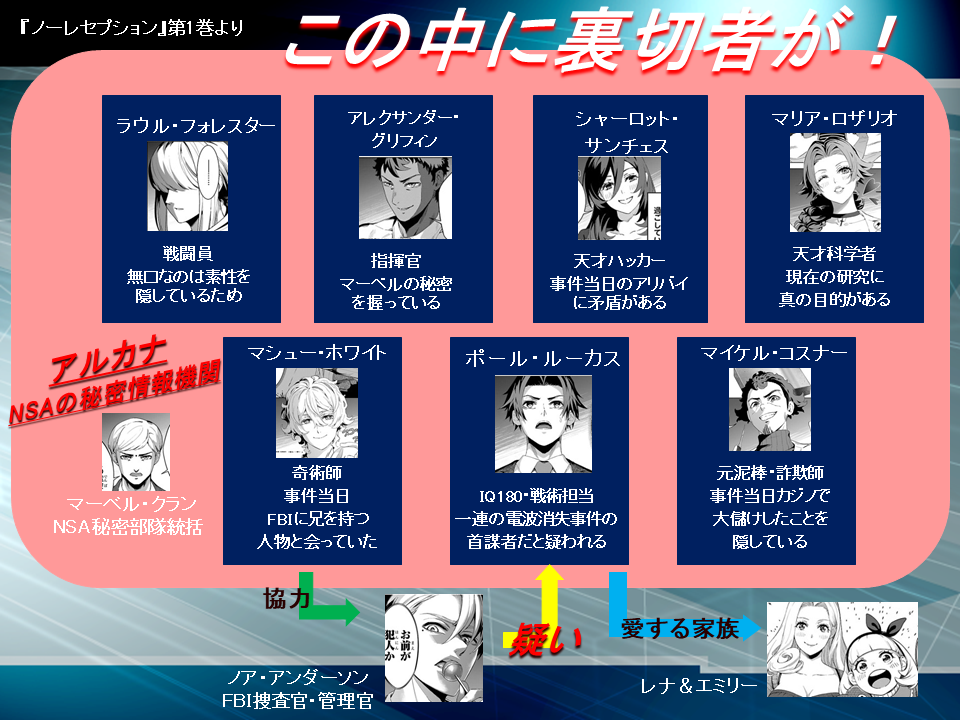 まず怪しい人物シャーロット、続いてマシューと次々に疑うポール。第1巻では、アルカナメンバーの秘密の情報がまとめられています。真相は今後の展開で明らかになっていくことでしょう。