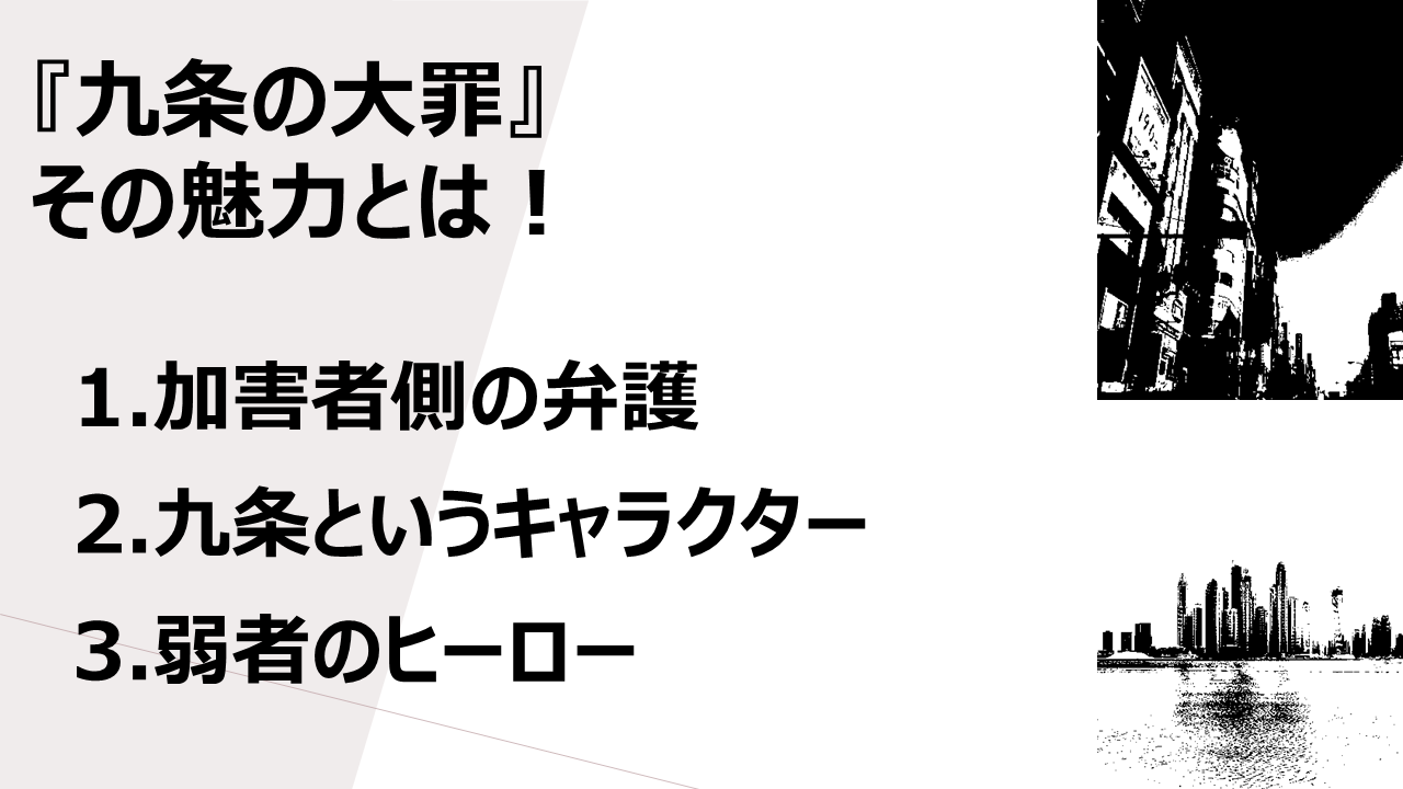 ニューダークヒーローとして注目される『九条の大罪』。その魅力とは一体どんなところにあるのでしょうか。