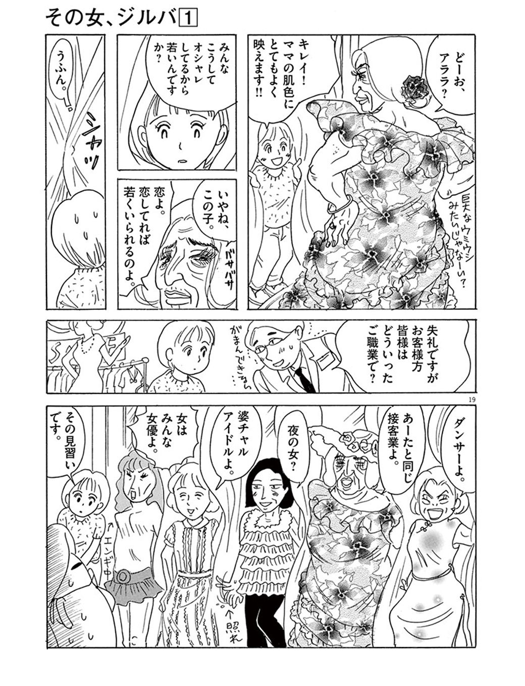 夜の世界へ飛び込み、40歳にしてホステスを始めた主人公・新。昼間はスーパーの倉庫で働いています。ある日の昼休み、同僚のスミレ、ミカと休んでいると、見知らぬ男がこちらを見つめていました。新たちは逃げるように去りましたが、帰宅途中にまたその男と遭遇します。どうやらジルバママを知っているようで……。