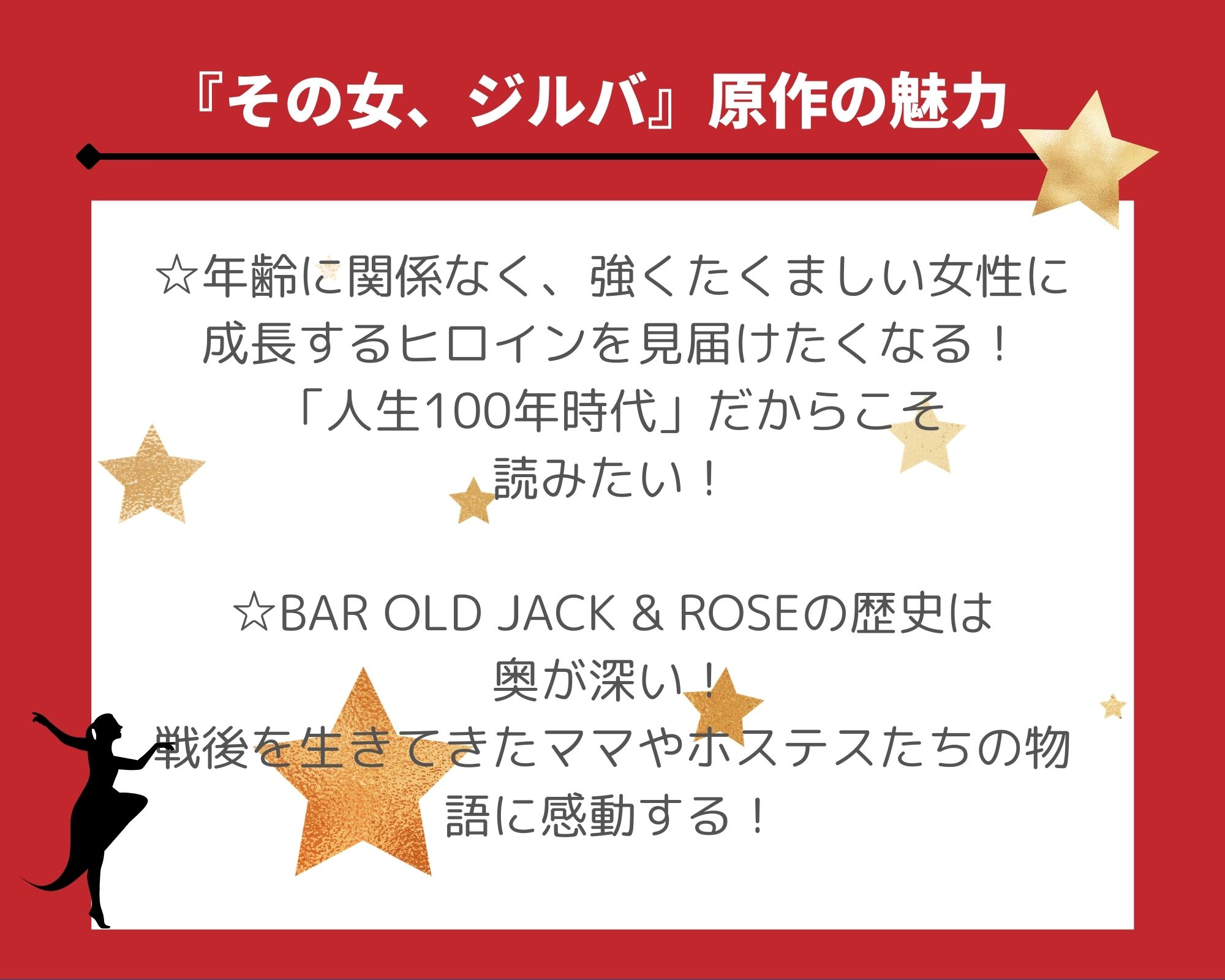 ブラジル移民だった初代ママ・ジルバ、戦後の日本で苦労したホステスたち、売春婦として生き延びた現役くじらママ。バーでは笑いが絶えず、いつも明るい彼女たちの過去は壮絶でした。主人公の新がBAR OLD JACK & ROSEで働き始めてから、亡きジルバの話から、バーができるまでのこと、それぞれの若かりし頃の出来事が明らかにされていくのが見所です。