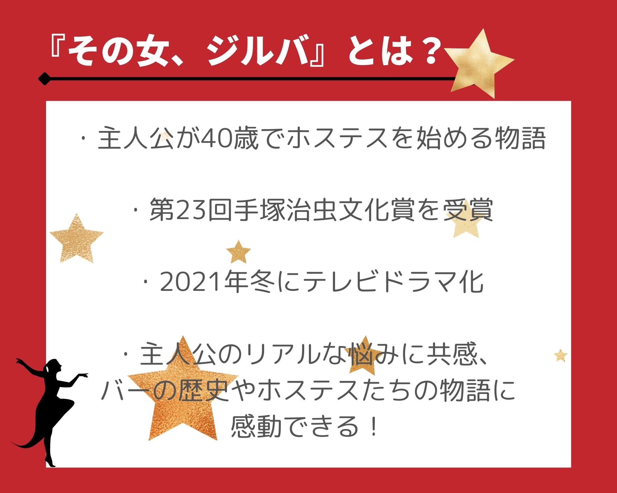 『その女、ジルバ』は40歳からホステスを始める女性とその高齢バーのストーリー。登場人物らの過去も未来も、リアルながら夢もあってグッときます。2021年冬に豪華キャストでドラマ化。「40」というヒロインの年齢が気になった方も多いのでは? この記事では、原作漫画『その女、ジルバ』全巻のあらすじと魅力をたっぷりとネタバレしていきます。