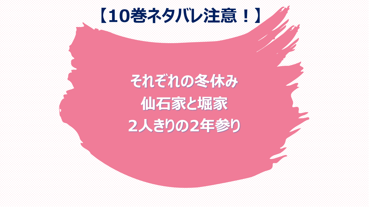 雪のクリスマス。堀にプロポーズする宮村。もちろん了承する堀でした。高校最後の冬休みは、それぞれで過ごしています。そんな中、堀と宮村は、2人で2年参りに行くことにしました。今年最後に会うのが宮村で来年最初に会うのが宮村だねという堀の言葉に、この先ずーっとそうだといいねと答える宮村でした。