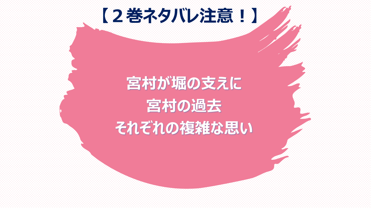 堀と親しくなる前の宮村の世界は閉ざされていました。小学校、中学校といつも1人ぼっちだった宮村。中学の時の親友・進藤だけが唯一、心を許せる人間でした。作中、たびたび登場する中学生の頃の宮村。現在の宮村がそんな彼に思いもよらない未来が待っていることを告げていきます。