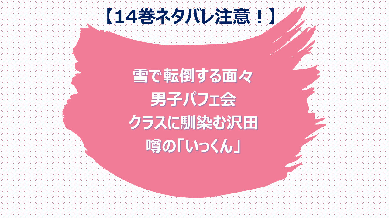 いつもの男子グループがファミレスでパフェ会、沢田が少しずつクラスメイトたちに馴染み、生徒会の面々のケンカエピソードといろいろな表情を見せる登場人物。ほっこりする日常が描かれています。