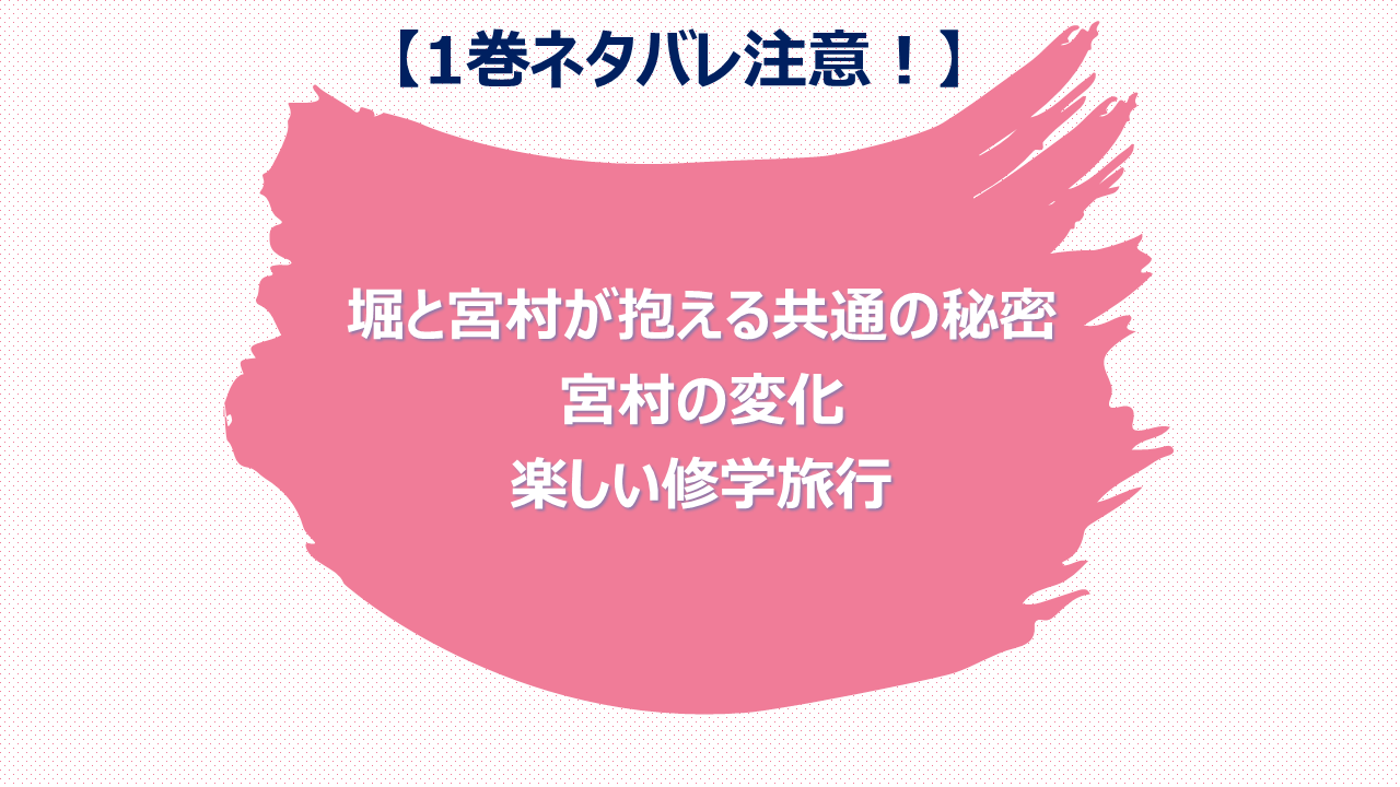 そして、秋の京都への修学旅行。宮村の刺青がバレなよう石川や堀が協力。みんなたくさんの思い出も残すことができ、修学旅行もあっという間に終わっていきます。今後、堀と宮村の関係はどうなっていくのか、気になる2人の表情で終わる1巻です。