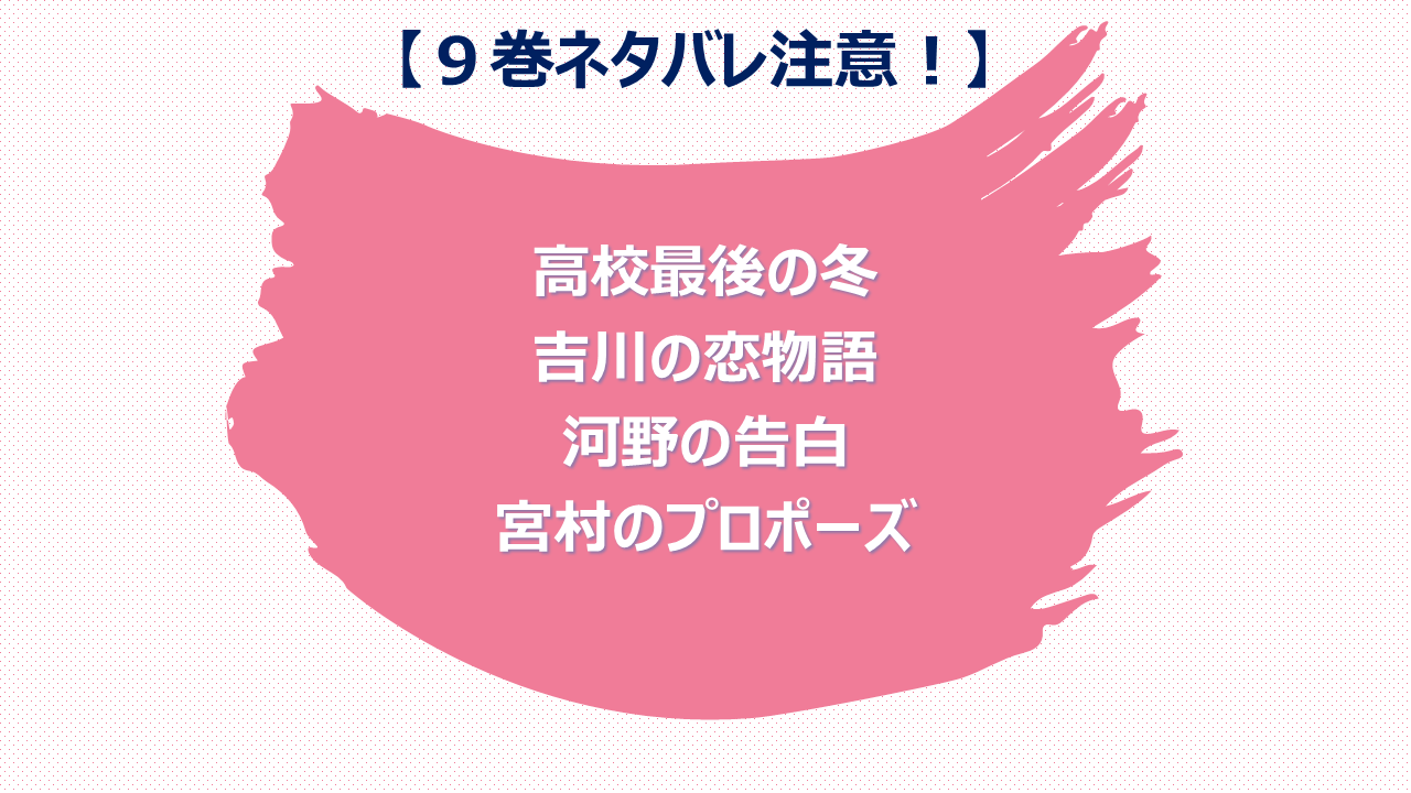 クリスマス。宮村家では店が大忙し。堀と宮村は一緒に過ごすことができません。堀家にケーキを届けた宮村は、雪の降る帰り道、堀と2人きりに。堀に卒業しても一緒にいたいと言われ、プロポーズする宮村でした。まさかの展開にドキドキの9巻です。