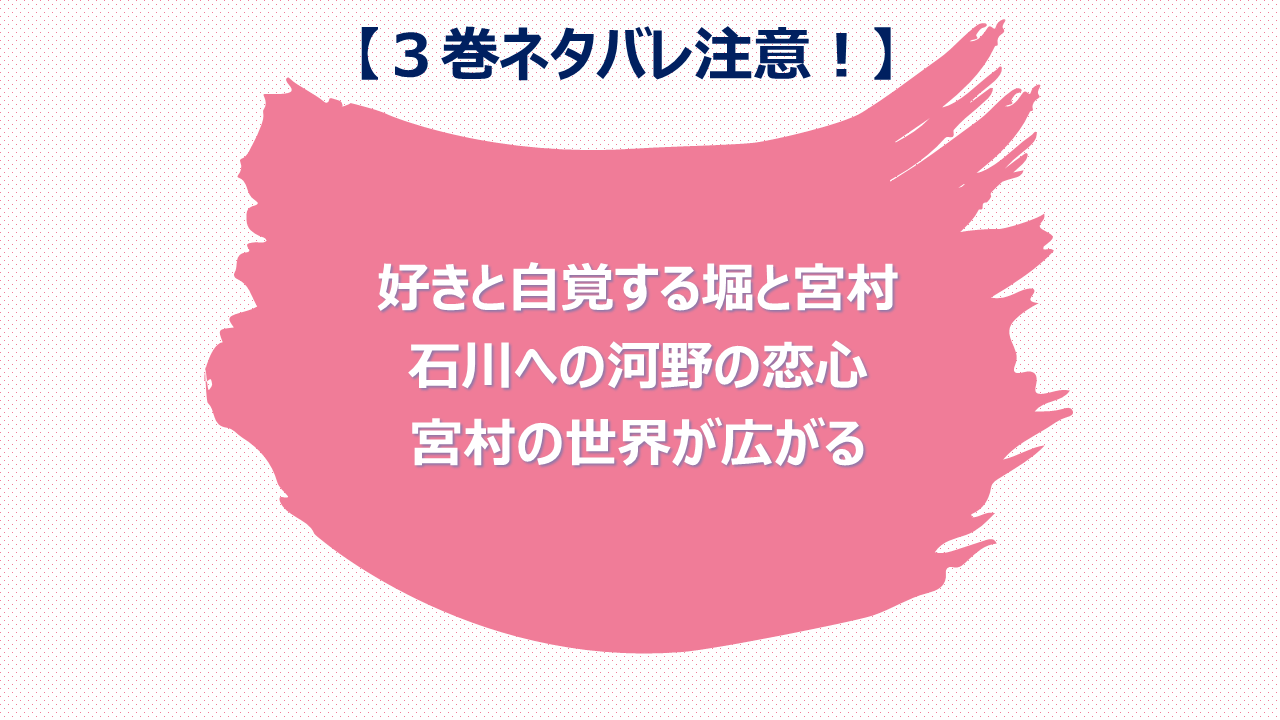 学校との顔とはあまりにも違う堀と宮村は、互いの素の顔を知るという共通の秘密を持つことで急接近していきます。そして、それぞれが大事な存在になっていくのです。特に、宮村は堀と親しくなることで、堀と仲のよい石川や吉川とも自然に親しくなることに。こうして、宮村の世界も少しずつ広がっていくのでした。