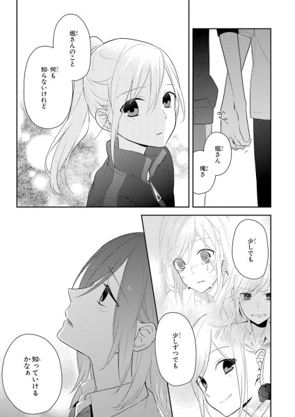 宮村が親戚の法事で4、5日東京を離れることになりました。堀とはメールで連絡を取り合うも、途中で充電切れとなり連絡が途絶えてしまいます。付き合ってから初めて宮村がそばにいないことを思い知る堀。互いが必要であると強く思う堀と宮村でした。
