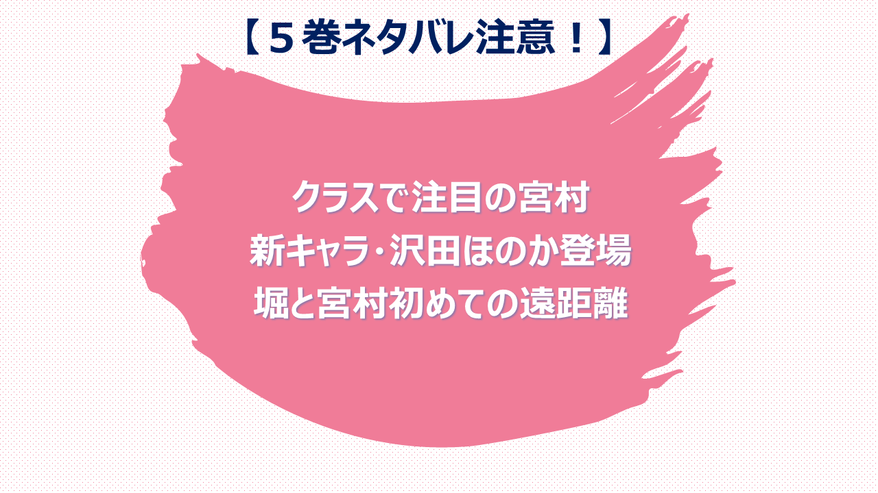 登校できるようになった堀でしたが、宮村を避けていました。それは、宮村が知らない他校の女子と親しげに歩いていたと創太から聞いていたからです。一緒にいたのは進藤の彼女のちかちゃん。進藤も一緒にいましたが、創太からは見えなかったようです。