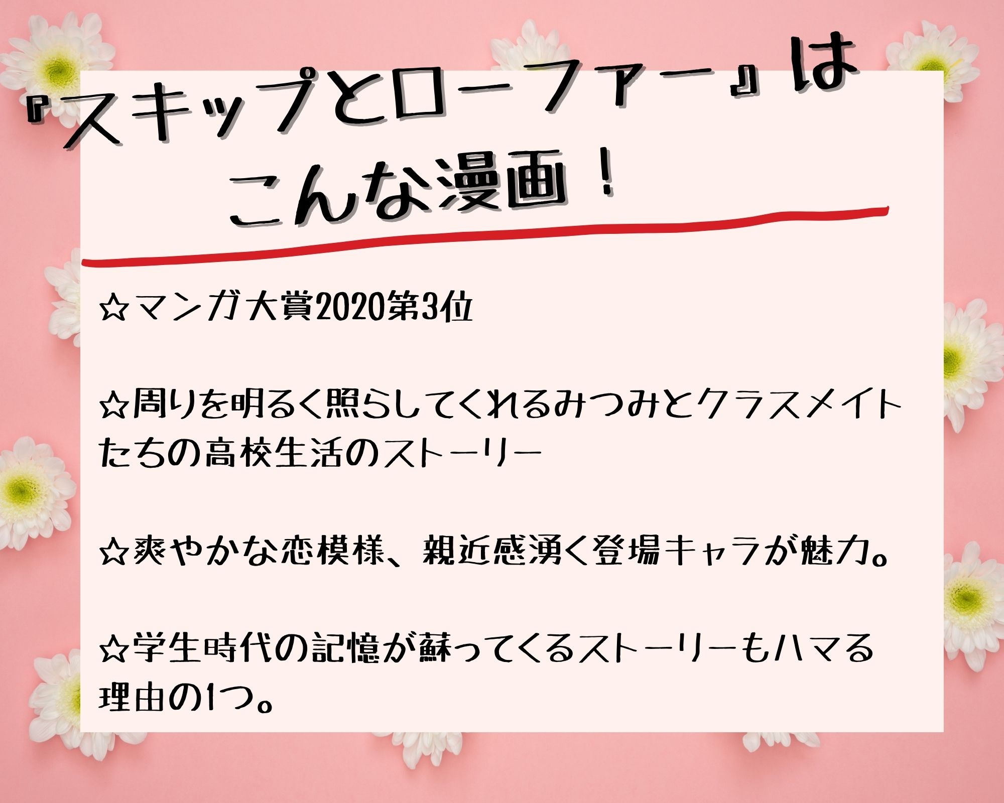 高松美咲によるスクールライフコメディ漫画の『スキップとローファー』。マンガ大賞2020で第3位になった話題作です。ヒロインのみつみとクラスメイトたちの高校生活を通して、青春の楽しさと登場人物たちの成長が描かれています。