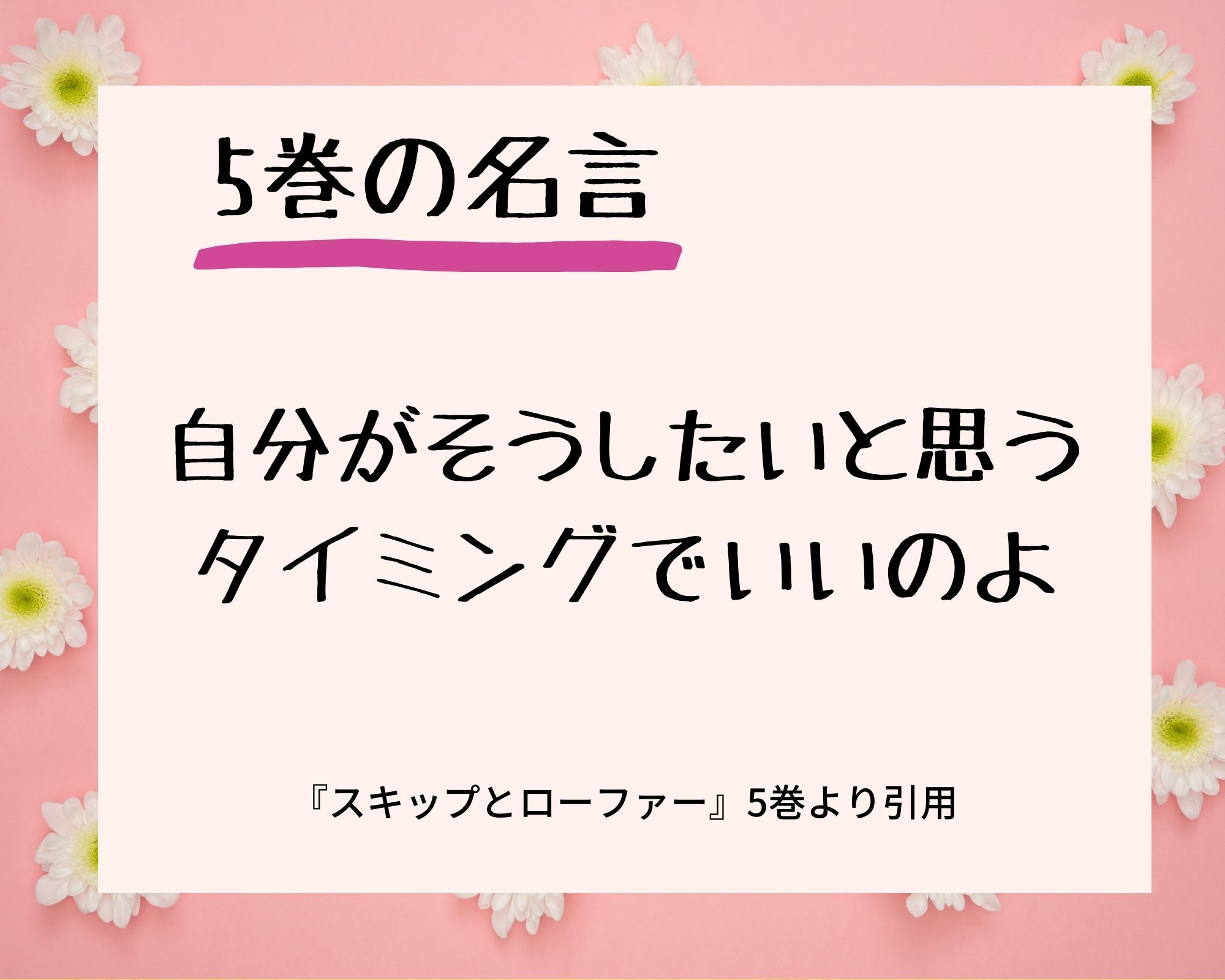 恋と同時に女子たちがオシャレに目覚める5巻。みつみはクラスメイトに感化され、ナオちゃんにオシャレについて相談します。ナオちゃんは、周りと比べてしまうみつみにこのように声を掛けました。オシャレには切りがありませんが、この名言を聞くと無理をしなくてもいいのだと思えますね。
