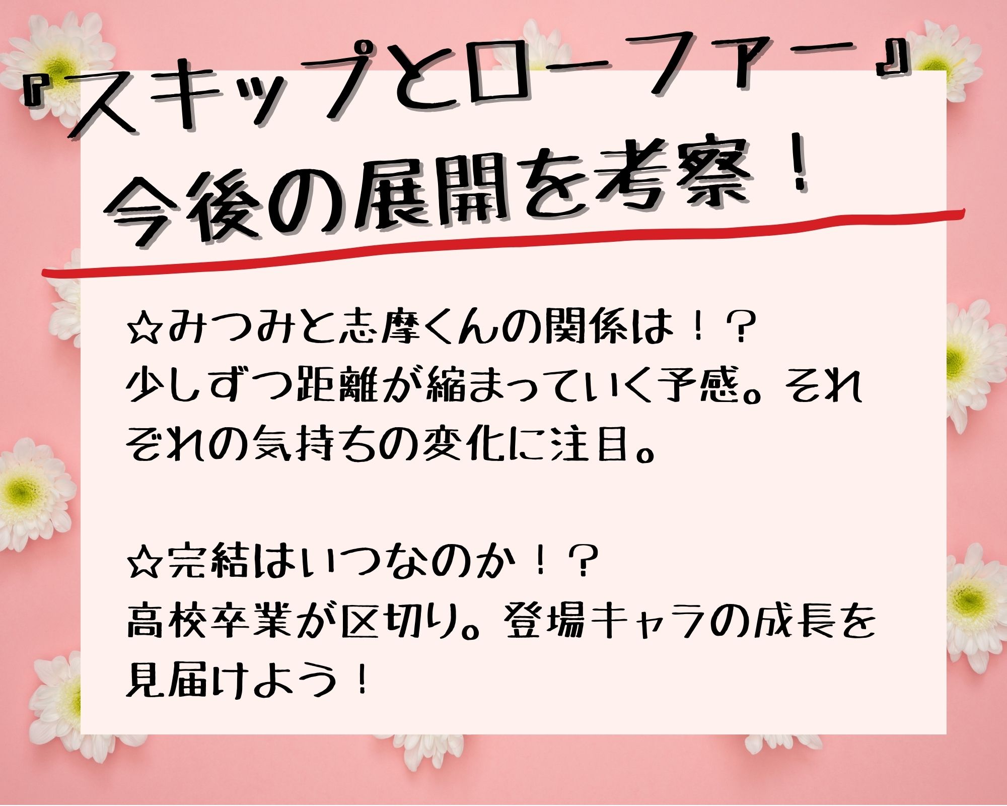 5巻はみつみの高校生活も初めての冬を迎え、クラスメイトとの絆も深まっていく『スキップとローファー』。最後に、今後の展開や完結のタイミングを考察していきます。