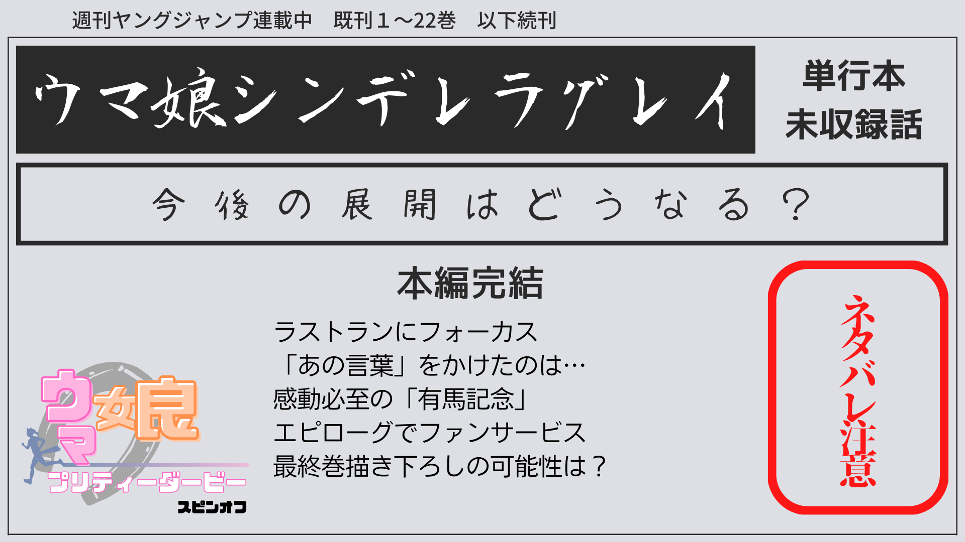 「シンデレラグレイ」の連載ですが、2025年12月25日に最終章「シンデレラグレイ」編が無事完結しました。最終回を迎えてしまったのでもはや予想ではありませんが、流れを簡単にまとめたいと思います。