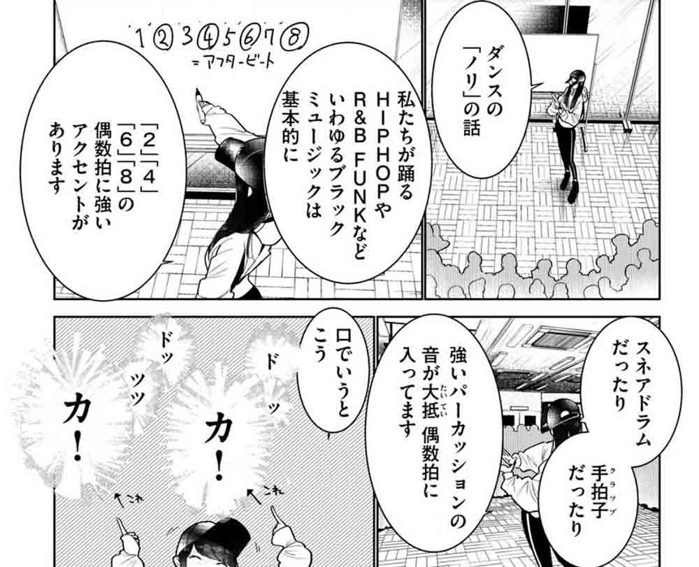 恩のダンスに目がいってしまう理由を、動画を視ながら模索するカボ。部活時に恩から教わった後拍アクセントの重要さを、自主練しながら実感していきます。