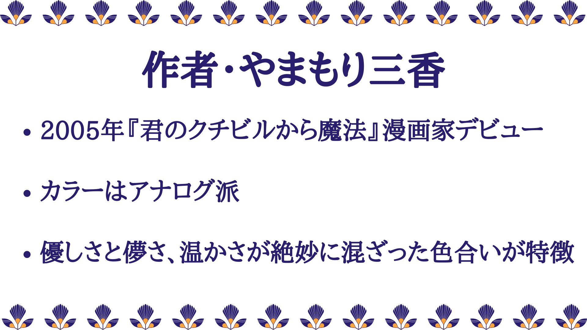 やまもり三香の特徴は、優しさと儚さ、そして温かさが絶妙に混ざった色合いです。デジタルで描きあげる漫画家が多いなか、いまだにカラーをアナログで行なっている作者。デジタルでは描けない微妙な色の陰影や淡さが、登場人物たちをよりリアルに感じられます。