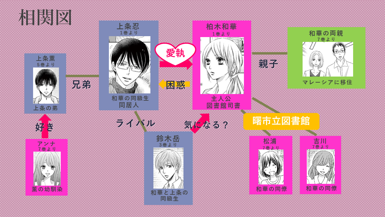 図書館司書の柏木和華は、何よりも本が大好き。恋愛はしばらくご無沙汰でしたが、仕事も充実しており特に興味もなく日々を過ごしていました。突然、両親の海外移住が決まり、大量の蔵書が収納できる物件を探すことに。そんな時、高校時代の同級生・上条忍と再会します。仕事の都合で10年振りにドイツから帰国した上条。和華には上条との忘れられないいわくつきの思い出があったのでした。