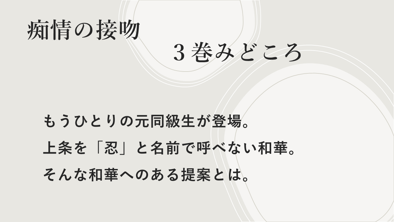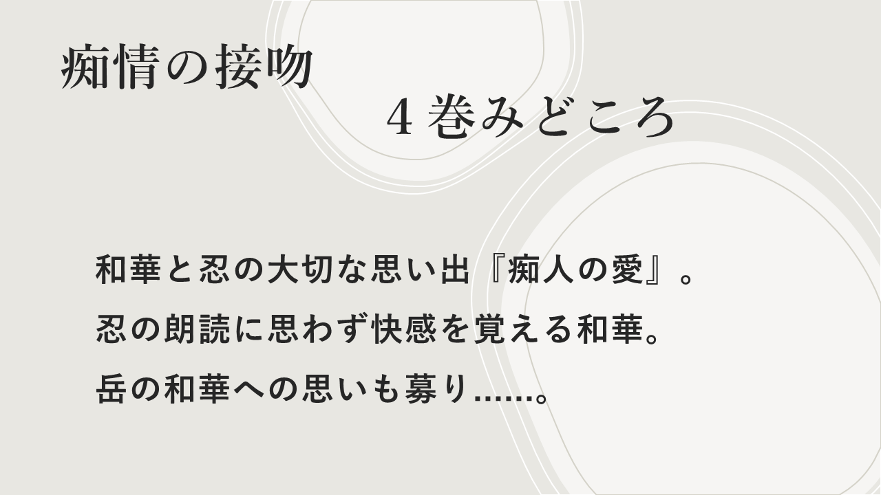 和華と上条を繋ぐ大事なものが谷崎潤一郎の『痴人の愛』。高校時代の和華と上条のいわくつきの出来事の時も、大人になってからの再会もこの本がきっかけです。作品タイトル『痴情の接吻』もこの『痴人の愛』からきているのでしょう。