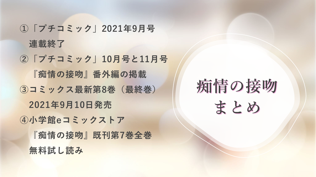 『痴情の接吻』は、女性向け漫画雑誌「プチコミック」にて連載していましたが、2021年9月号をもって最終回を迎えました。コミックス最終第8巻は、2021年9月10日に発売を予定しています。