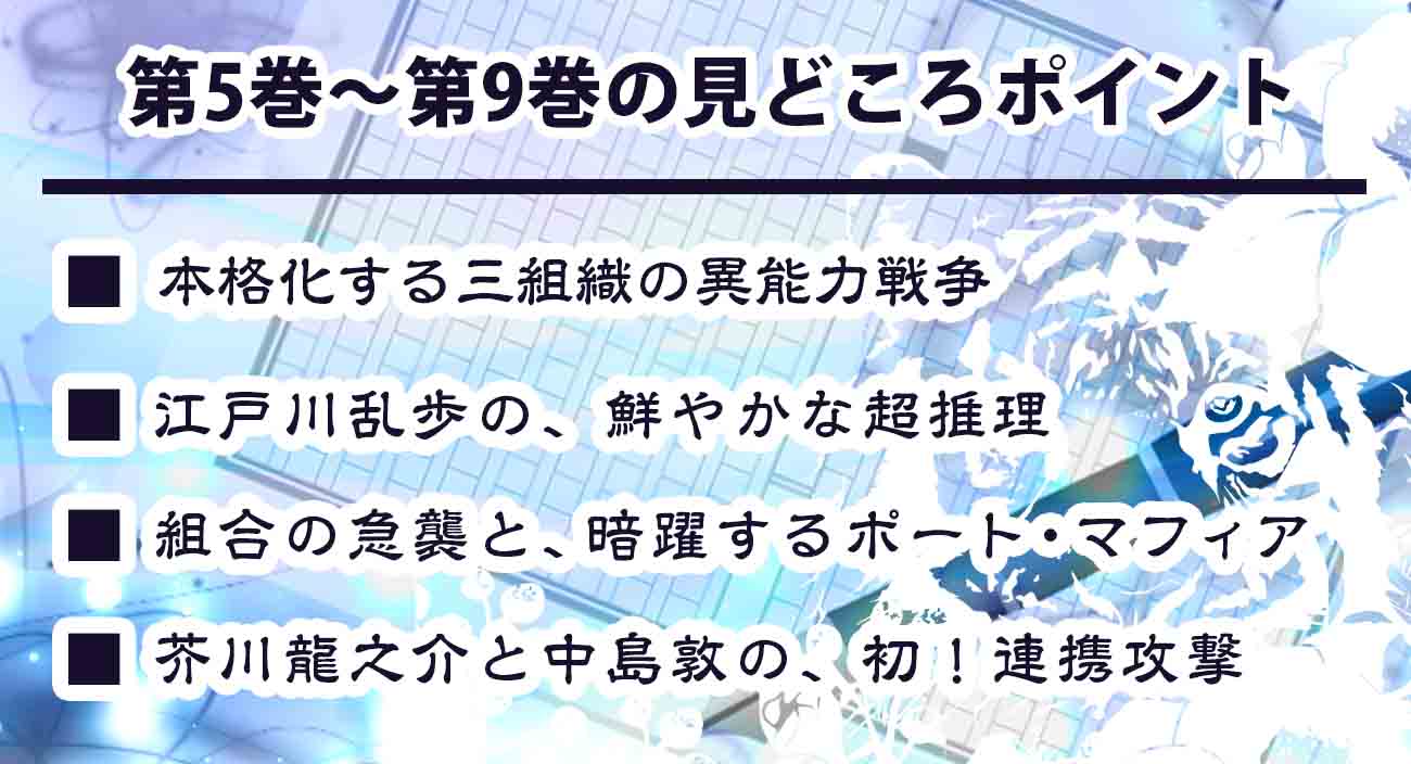 まだアニメ化されていない第14巻以降。新たな強敵・天人五衰の登場により武装探偵社が、かつてない窮地に追い込まれていきます。
