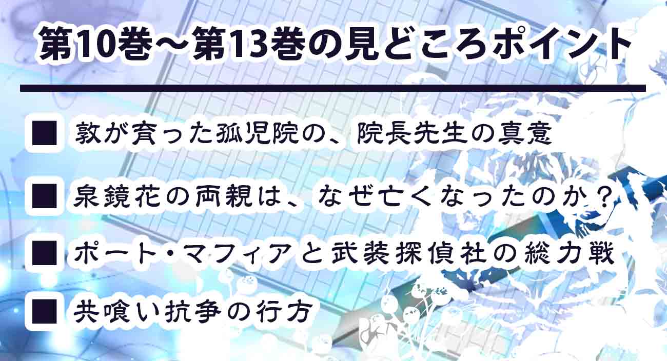 共喰いにかかった福沢と森の、命の行方がわかる第13巻。太宰の命で、敦と芥川のコンビネーションが復活。探偵社とマフィア総出の作戦が、見物です。