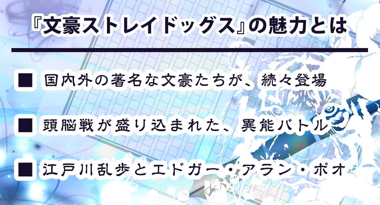 個性あふれるキャラがバトルをくり広げる、魅力いっぱいの漫画『文豪ストレイドッグス』。ここでは本作の見どころポイントや魅力を考察していきます。
