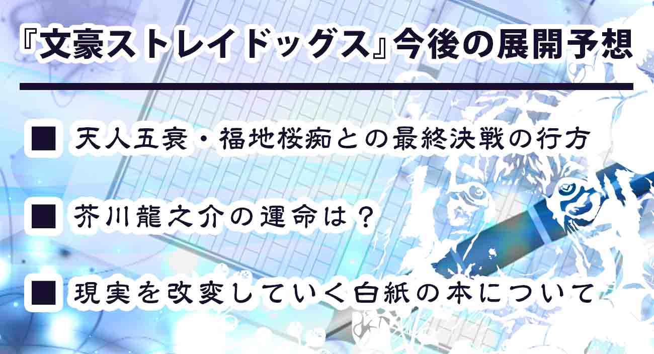 強すぎる福地との戦いも、いよいよ最終局面を迎え始めた漫画『文豪ストレイドッグス』。ここではポイントを踏まえながら、物語の今後の展開を予想したいと思います。