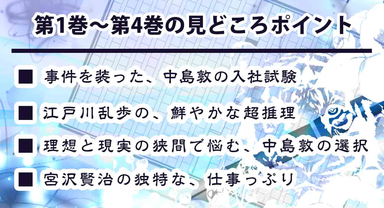 太宰とのひょんな出会いから、敦が武装探偵社に入社する第1巻。事件を装った入社試験が見どころです。