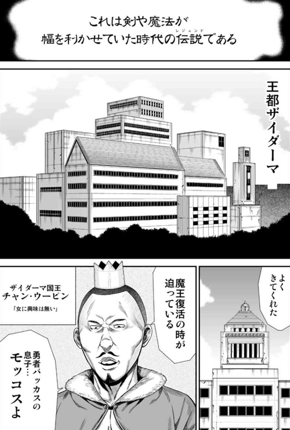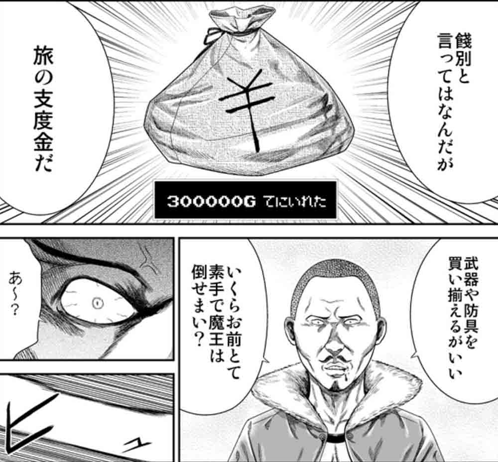 王都ザイダーマの国王は、勇者モッコスに魔王討伐を依頼。旅の支度金を国王から受け取り、ヤクザかチンピラかのような振る舞いをしながら準備を進めていきます。