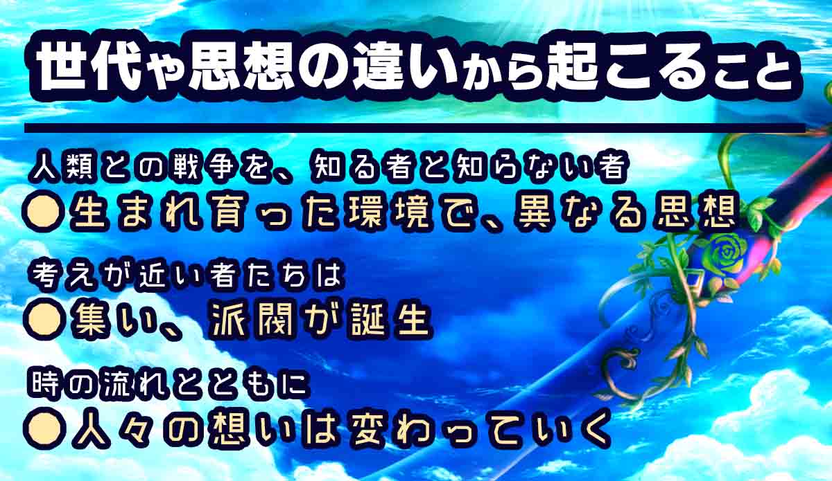 やがて考え方が近い者たちは集い、派閥が誕生。相反する思想だとわかると、諍いが生じ始めます。新人類も例外ではなく、派閥間の考えはどこまでいっても平行線に。