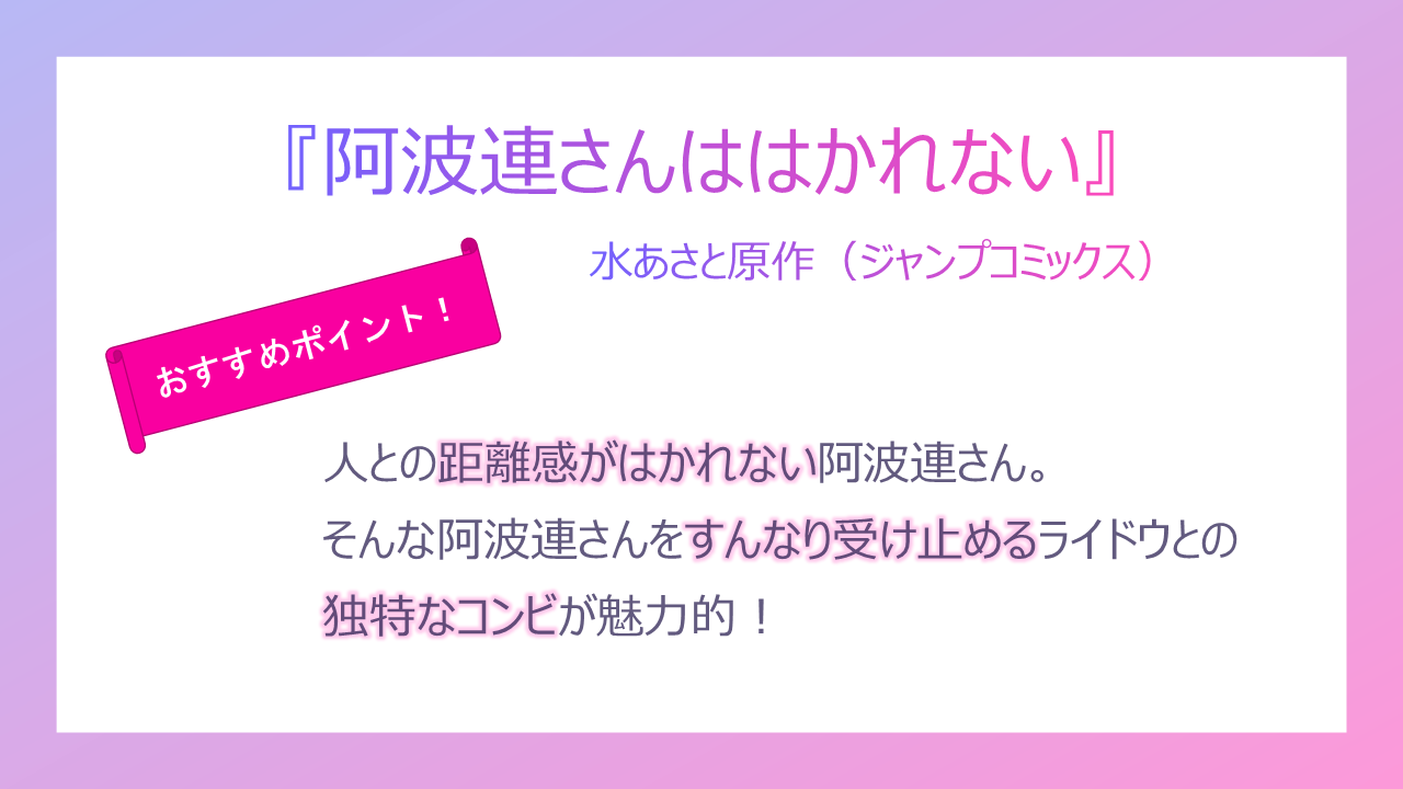 なかなか人との距離がはかれない阿波連さん。その隣の席のライドウは、阿波連さんとの距離を感じていました。たまたまライドウが阿波連さんの落とした消しゴムを拾ったことがきっかけで、交流を持つようになる2人。阿波連さんの予測不能な行動をライドウが受け入れながら、徐々に2人の心の距離も縮まっていくのでした。