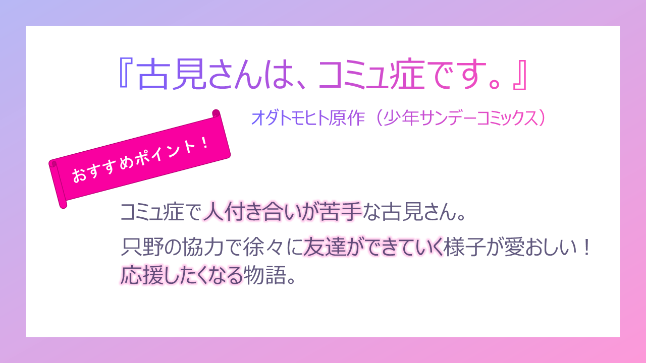 人づきあいが苦手なコミュ症の女子高生・古見さんと周りの空気を読むのが得意な同級生・只野。ひょんなことから、只野の協力のもと「友達を100人作る」という古見さんの夢を叶えることに。そんな2人の様子を描いた漫画『古見さんは、コミュ症です。』。