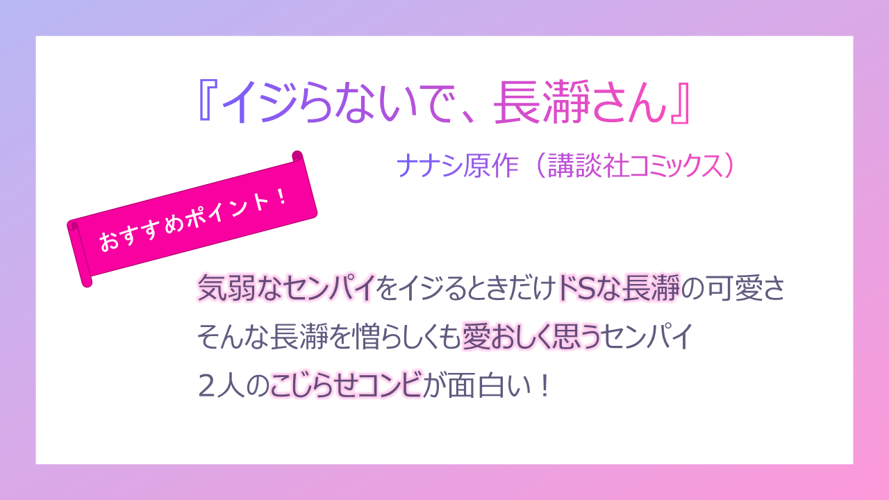 気弱で大人しい高校2年のセンパイがいつものように図書室に行くと、そこには1年生の女子集団が騒いでいました。その中の1人、ドSな長瀞に目をつけられるセンパイ。何かとイジってくる長瀞とセンパイのやりとりを描いた物語です。