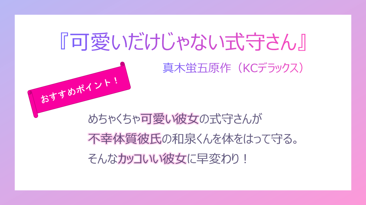 『可愛いだけじゃない式守さん』は、不幸体質の和泉くんとめちゃくちゃ可愛い式守さんという高校生カップルの物語です。普段はとびっきり可愛い式守さんが和泉くんを守るため、時にカッコいい彼女に早変わりするという学園ラブコメディ。