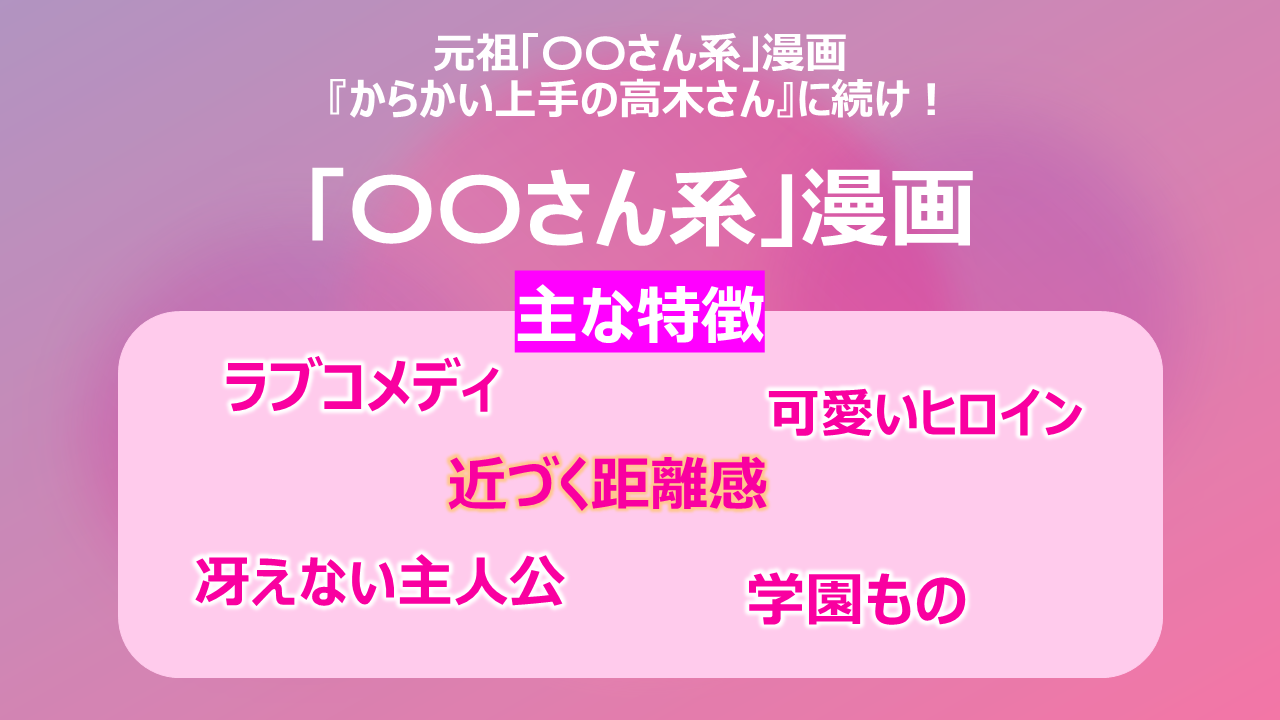 今回は「〇〇さん系」漫画を紹介しました。元祖「〇〇さん系」漫画『からかい上手の高木さん』に続く人気作が続々と発表されています。たくさんあるその作品の中から、特におすすめしたい「〇〇さん系」漫画をセレクションしました。ぜひさまざまな作品に触れてみてください!