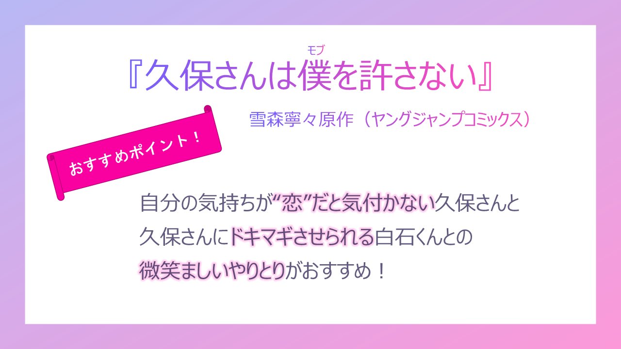 『久保さんは僕を許さない』は、「週刊ヤングジャンプ」にて連載中の学園ラブコメディ。「僕」は「モブ」と読みます。