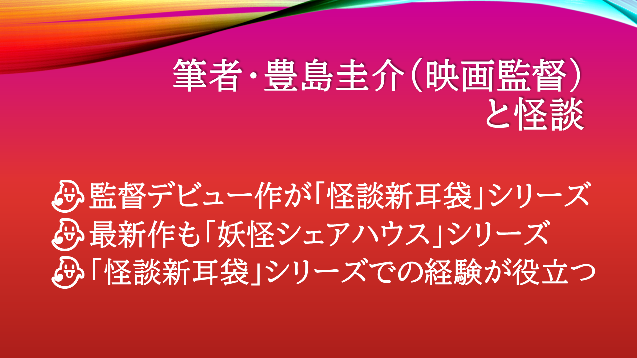 豊島監督といえば、監督デビュー作がドラマ「怪談新耳袋」シリーズというホラー作品です。その後も「怪奇大家族」シリーズ、「妖怪シェアハウス」シリーズなどといったオカルト作品なども監督しています。