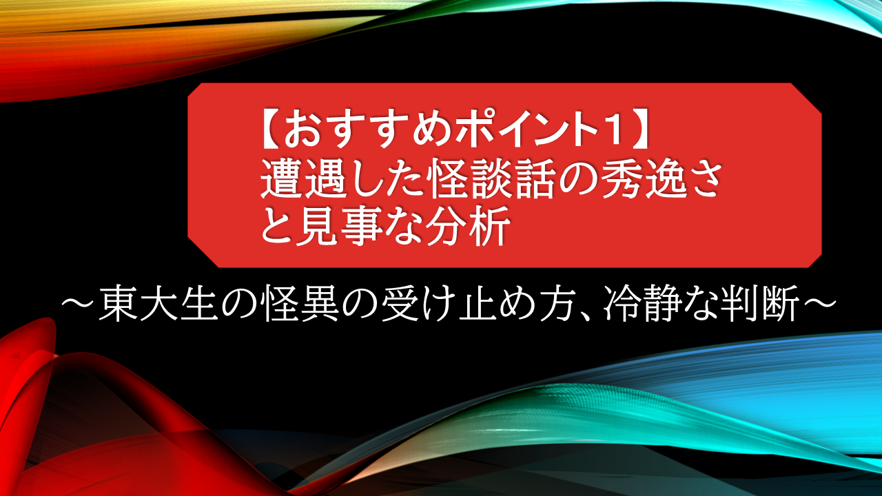 自身が体験した心霊現象を客観的に捉え、怪異をとても自然に受け入れています。そんなところが本書にもよく現れており、『東大怪談』という書籍の面白さのひとつとなっています。
