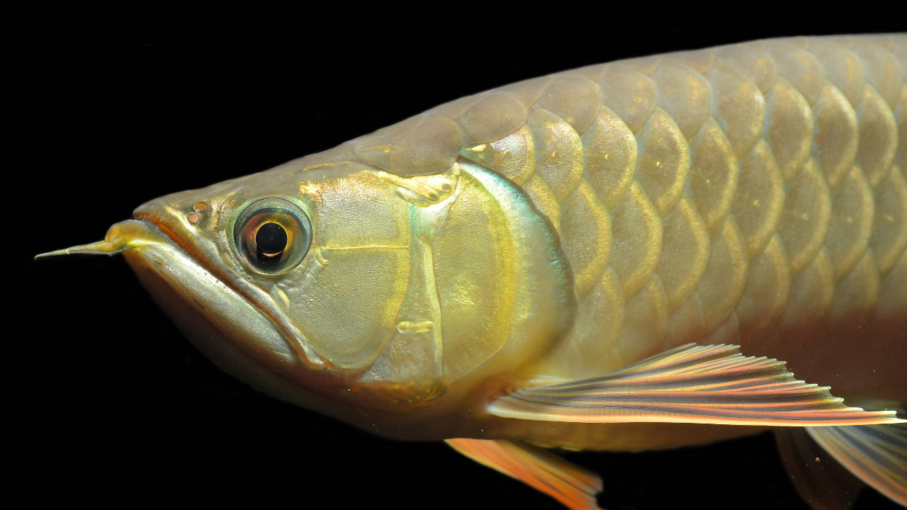 アロワナは下唇が突き出たような形なのに対し、ピラルクにはそのような特徴がなく、横に平たい頭部が特徴的です。