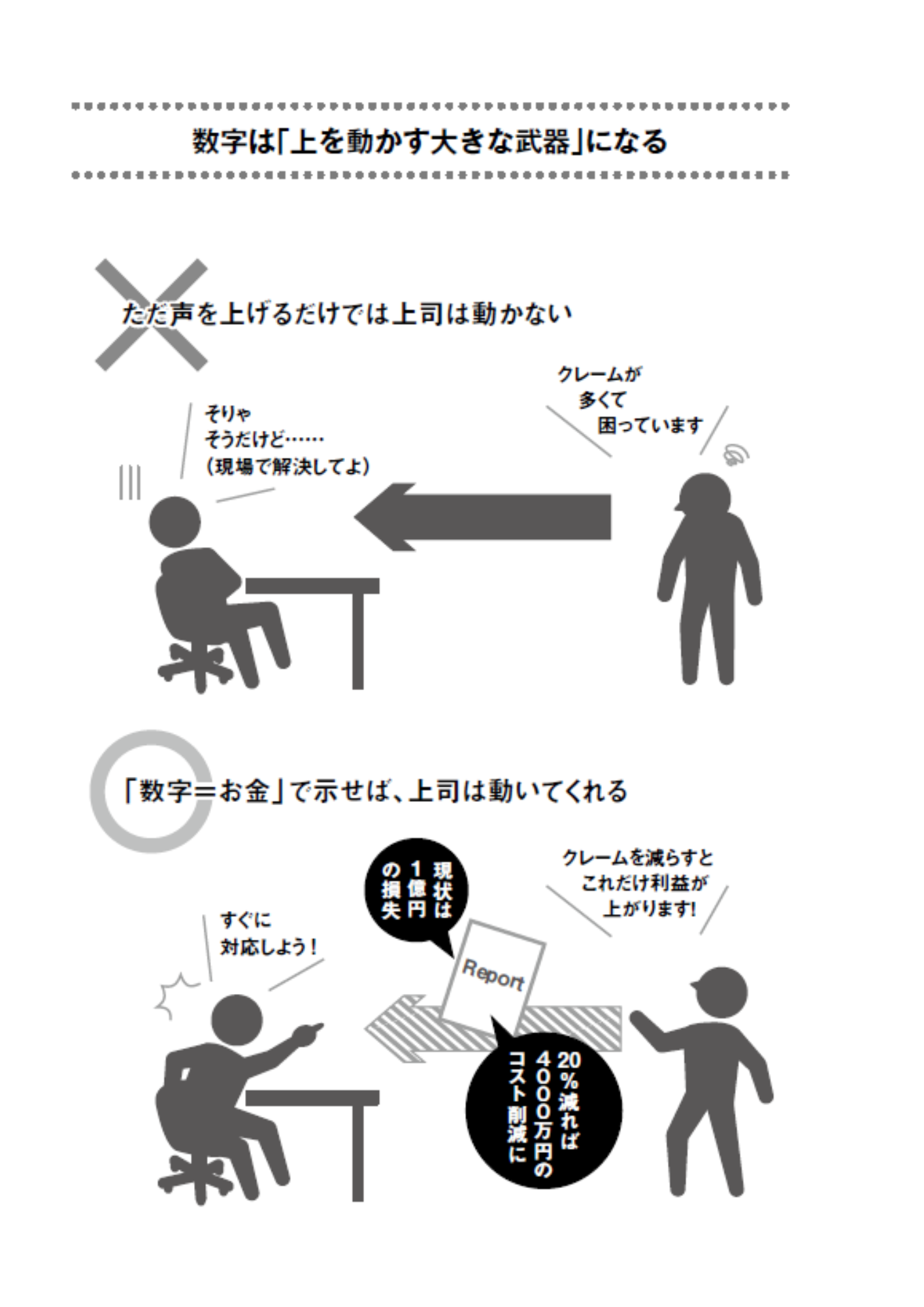 これが「モデムに関するクレームが多いので、何とかしてほしい」と頼んだだけだったら、上は動いてくれなかったでしょう。しかし、数字という客観的な事実をもとに、「この問題を解決すれば、会社の経営にとってこれだけ大きなメリットがある」と示すことができれば、上の立場の人間も納得し、自ら動いてくれます。要するに、「数字=お金に換算しなければ、上は自分たちの問題として認識してくれない」のです。