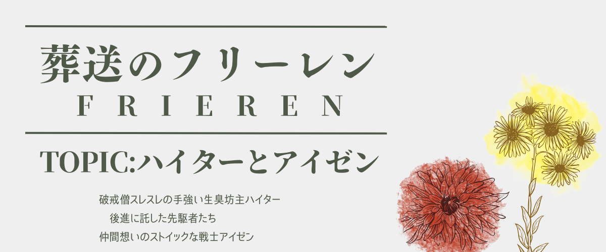 時間感覚は人間とエルフの中間くらいであり、どちらにも共感出来るため、感覚のズレが大きいフリーレンを気にかける様子があります。フリーレンたちの旅の大目標、北の地にある「天国(オレオール)」を目指す旅はアイゼンの与えた助言がきっかけ。