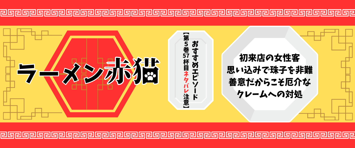 飲食店にトラブルは付きものですが、「ラーメン赤猫」でも同様。大小さまざまな問題からクレーマーが出てきます。現実だと飲食店側がとりあえず謝罪対応しがちですが、「ラーメン赤猫」では明らかに問題がない場合、毅然とした対応を取ります。普段寡黙な文蔵、柔和な佐々木が矢面に立って、しっかり上司の姿を見せるのがちょっと感動。