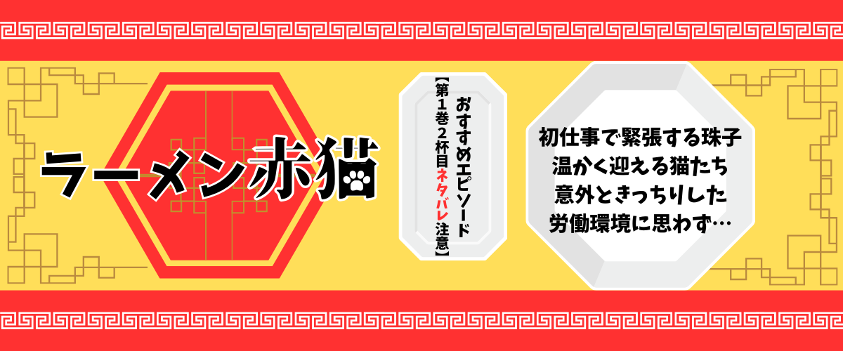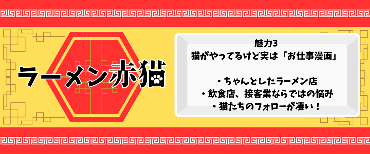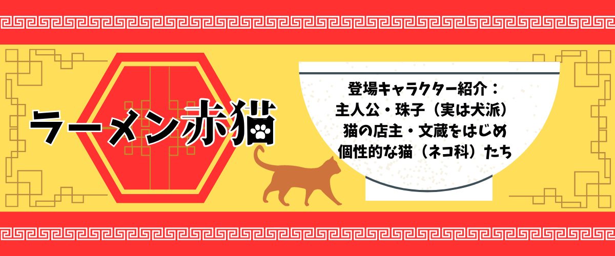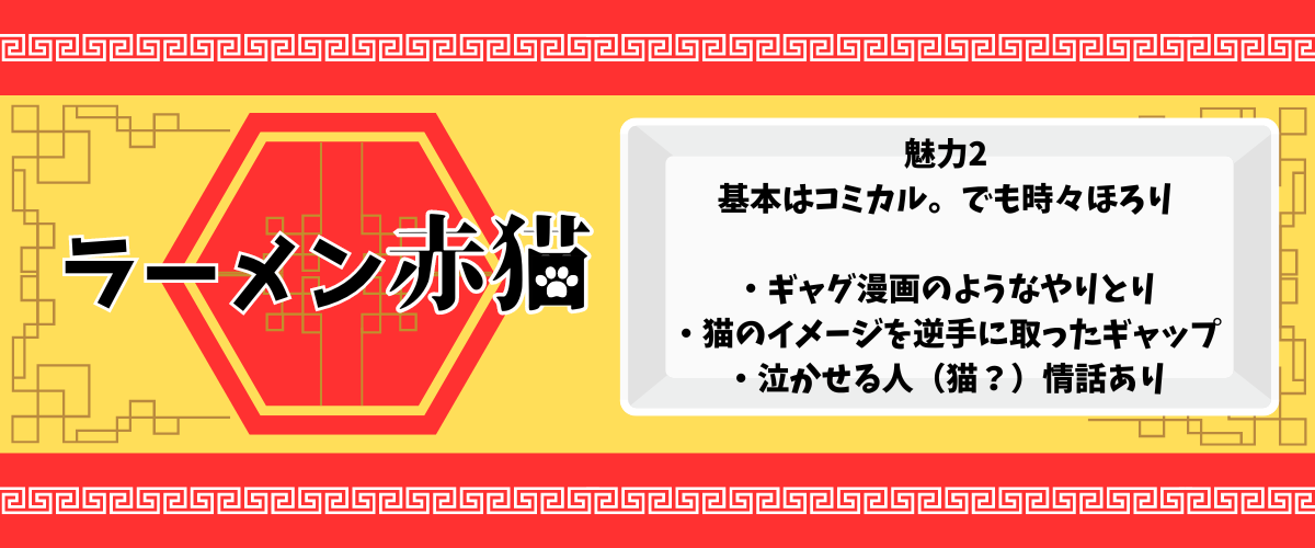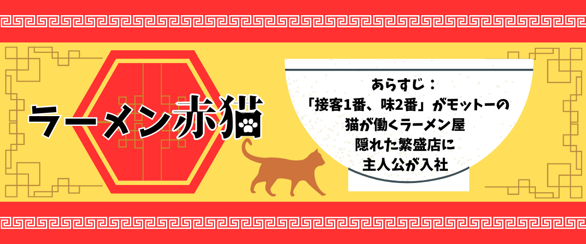 タイトル通りラーメン屋「ラーメン赤猫」(以下、店名を指す場合は「」表記)がメインの作品ですが、主要人物の大半が猫という異色の動物漫画でもあります。
