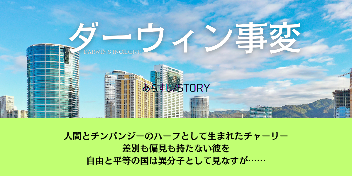 『ダーウィン事変』は人間とチンパンジーの混血(ヒューマンジー)が登場するという、かなりパンチの効いた設定が目を引きます。しかし実は、差別のはびこる社会やテロの脅威といった、現実的なテーマをメインとした骨太なストーリーが魅力。創作物としての嘘以外を可能な限りリアルにすることで、作品全体に説得力を与えているのです。