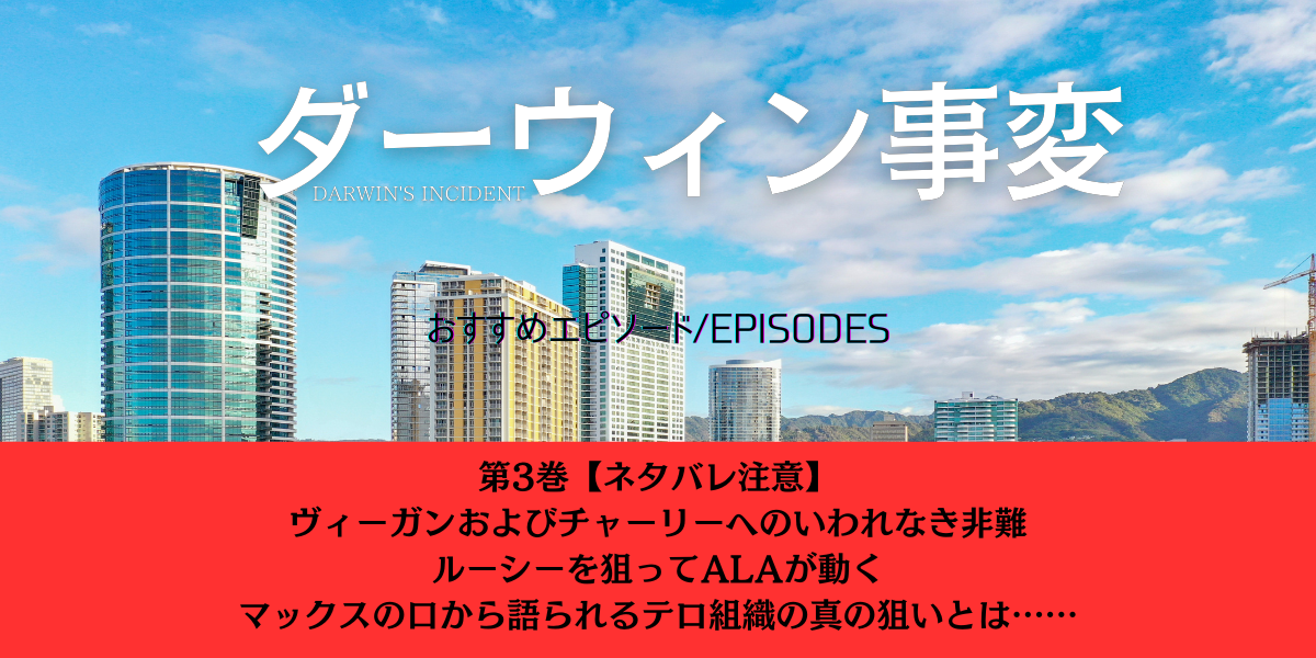 ALAは動物虐待をなくし、動物の権利を獲得するための団体のはずでした。事実ほぼすべての構成員はそう思っていますし、乱射事件の少年もそうでした。ところが、マックスの本当の狙いはチャーリーを表舞台に立たせることで、社会の価値観の変化を早める……つまり人類の進化の促進が目的だったのです。