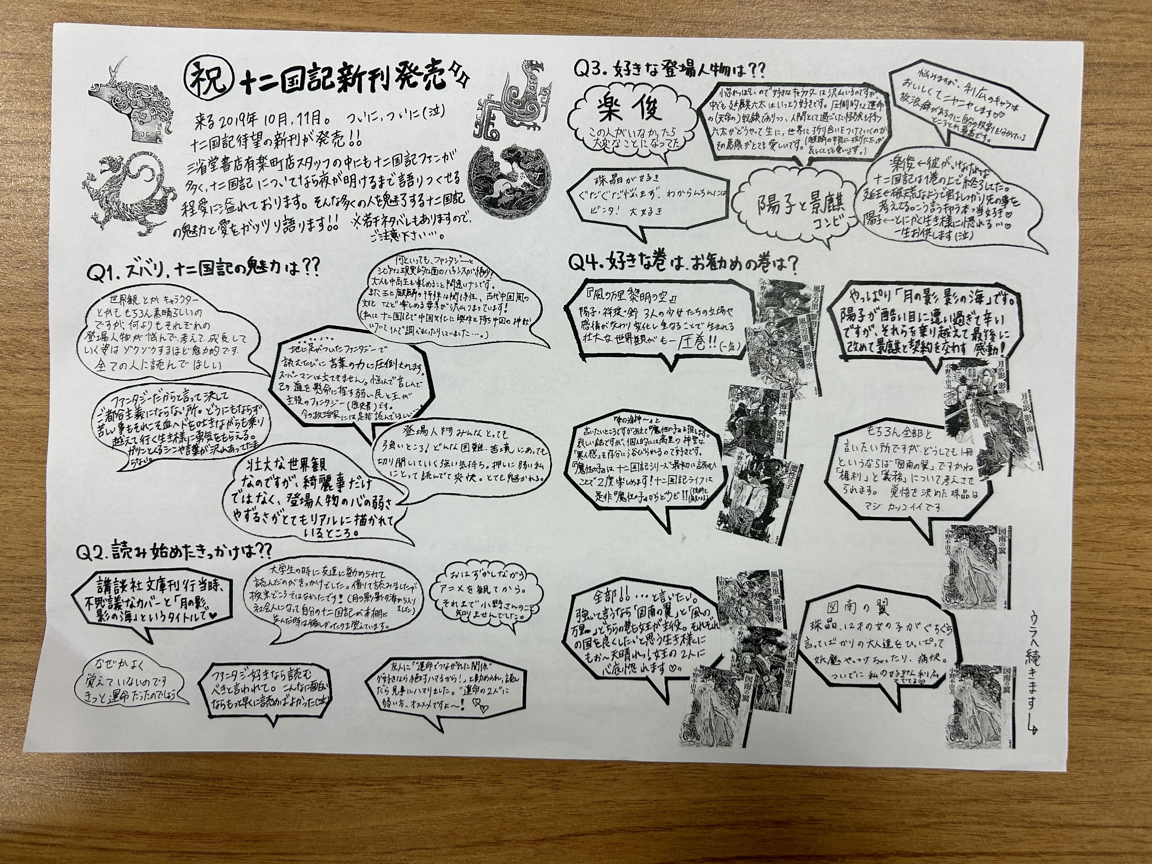 18年ぶりの新刊が発売された際に、『十二国記』を読み始めたきっかけや作品の魅力について、スタッフさんからのコメントを集めたペーパーを作成し、お客さんへ無料で配布していました。